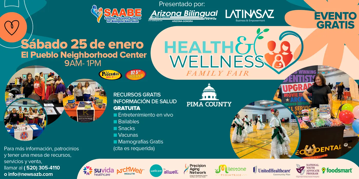 SAABE (Alianza del Sur de Arizona para la Educación Bilingüe), en asociación con la publicación Arizona Bilingüe Newspaper y Latinas AZ., ofrecen La Feria de Salud y Bienestar para la familia en su cuarta edición. Este evento comunitario tendrá lugar el sábado 25 de Enero del 2024, en el Pueblo Activity Center, edificio #9, en la esquina de Irvington & Nogales Hwy; el evento dará inicio a las 9 AM – 1PM, donde habrá información, recursos bilingües, regalos, música, entretenimiento y muchas sorpresas más. Además, se brindarán mamografías gratuitas en el esfuerzo por la lucha contra el cáncer de mama. ¡Las primeras 250 personas que lleguen el día del evento, obtendrán una bolsa completamente Gratis! (este evento será dentro del edificio).